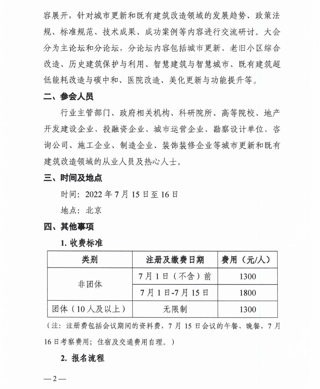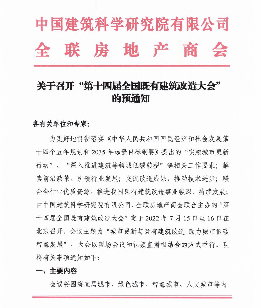 为更好地贯彻落实《中华人民共和国国民经济和社会发展第十四个五年规划和2035年远景目标纲要》提出的“实施城市更新行动”、“深入推进建筑等领域低碳转型”等相关工作要求;解读前沿政策、引领行业发展;交流改造成果,推动技术进步;联合全行业优质资源,推进我国既有建筑改造事业纵深、持续发展;由中国建筑科学研究院有限公司、全联房地产商会联合主办,中国建筑科学研究院有限公司、全联房地产商会城市更新分会联合承办的“第十四届全国既有建筑改造大会”定于2022年7月15日至16日在北京召开。大会以现场会议和视频直播相结合的方式举行。